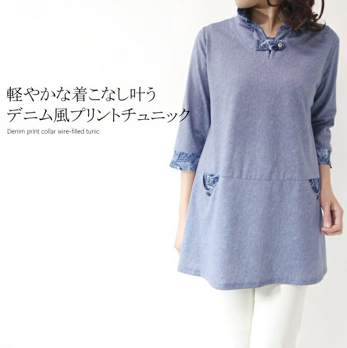 襟ワイヤーデニム風プリントチュニック 50代 ファッション ミセス 40代 60代 春 アラフォー 秋 母の日 プレゼント カジュアル