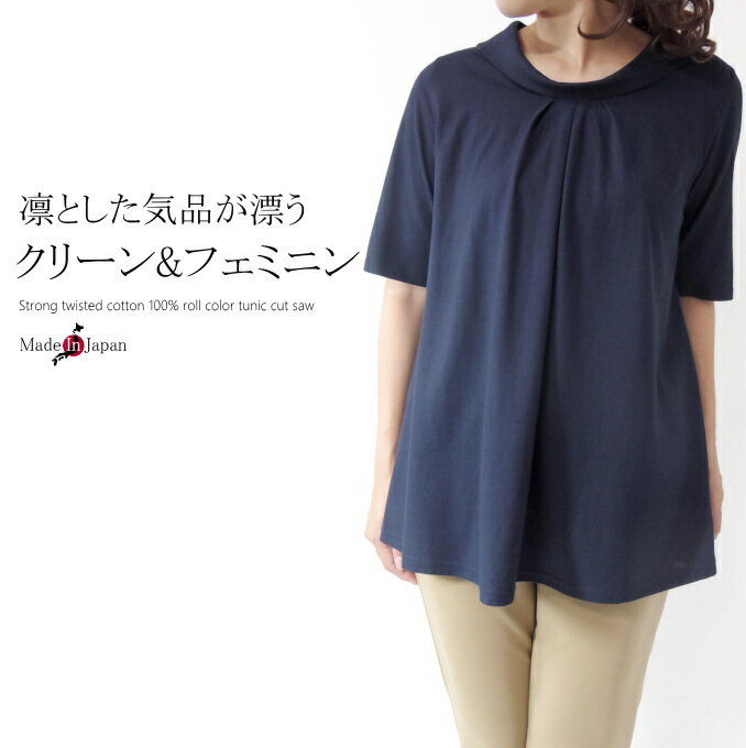 【商品説明】 サラサラと心地よく、カットソーなのに上品さが漂う美しい光沢感が魅力の国産の上質な強撚糸コットンチュニックカットソー。 上品でいてクラシカルな女性らしさを演出してくれる、首の周囲を巻くように折り返したロールカラーデザインは、小顔効果も◎ 襟もとの中心にタックを施しているので、ラインを拾わないゆとりがありながら、裾に向かってきれいなドレープを描くAラインシルエットで、体系を美しくカバーしてくれます。 二の腕をすっぽり覆う五分袖なので、一枚でも安心してお召し頂けます。 気負わずに着られるカットソーながら、清潔感と上品さ、ほんのりと甘さが香るカジュアルでも女性らしさ漂う上質カットソーです